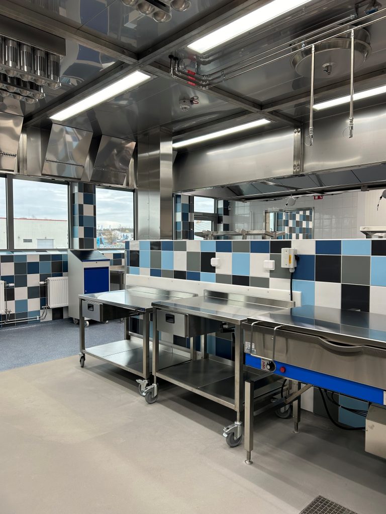 Besökarna fick en insyn i det välplanerade leveranssystemet av livsmedel, utformat för att garantera högsta möjliga hygienfaktor och förhindra att något förgås. Därefter blev vi visade in i själva hjärtat av byggnaden, produktionsköket. En öppen, ljus, optimerad arbetsyta som främjar snabb kommunikation och säkra förflyttningar. Säkerhet är en topprioritet för alla som jobbar i och runt den ofta tunga, varma, högljudda köksindustrin. Därefter kyls maten snabbt och effektivt innan den packas i tråg eller matlådor, beroende på vart i kommunen den ska ta vägen.